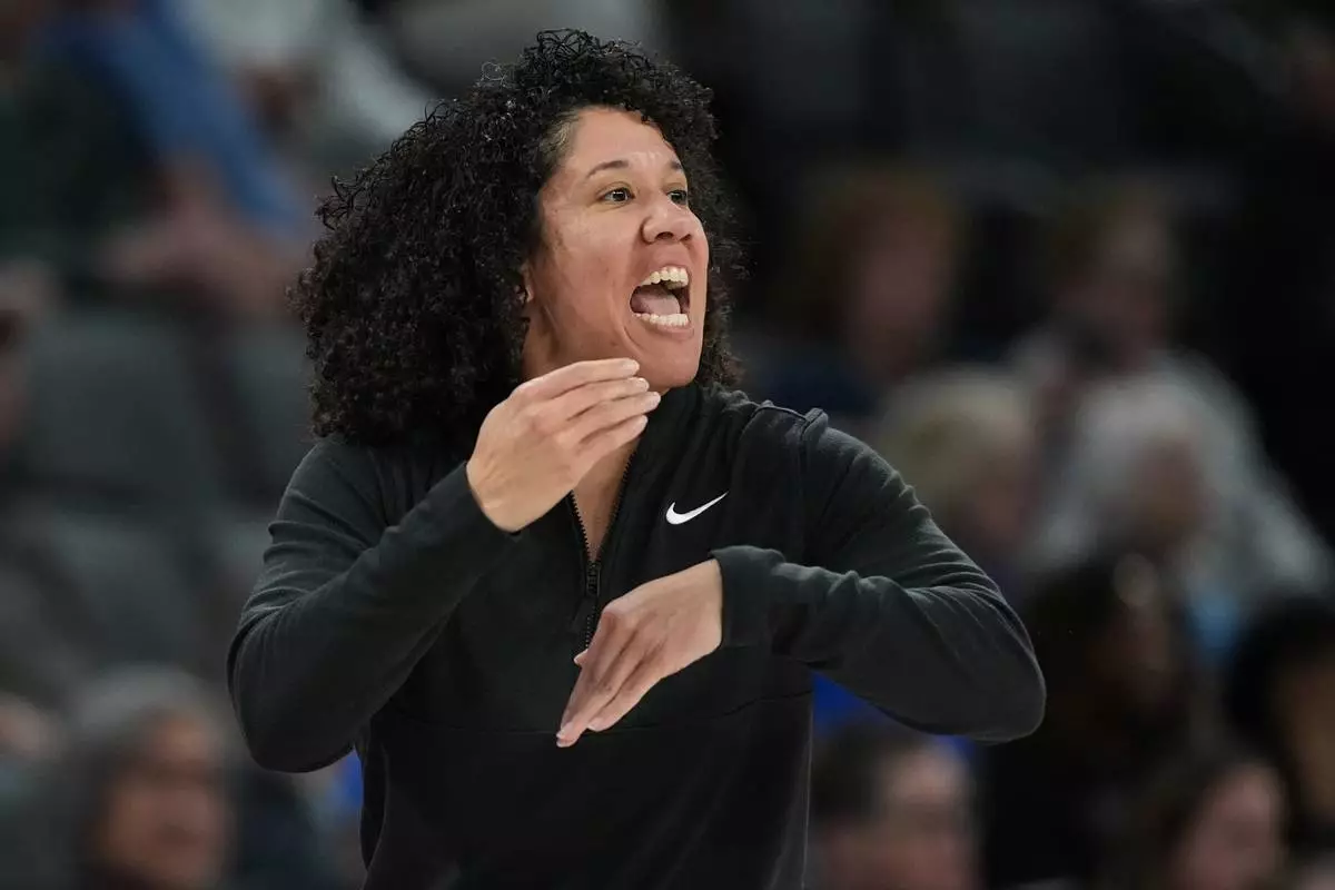FILE - North Carolina head coach Courtney Banghart gestures towards the court during the first half against West Virginia in the second round of the NCAA college basketball tournament in Chapel Hill, N.C., March 24, 2025. (AP Photo/Ben McKeown, File)