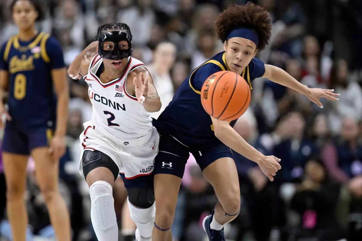 FILE - UConn guard KK Arnold (2) and Notre Dame guard Hannah Hidalgo (3) chase a loose ball in the second half of an NCAA college basketball game, Jan. 19, 2026, in Storrs, Conn. (AP Photo/Jessica Hill, File)