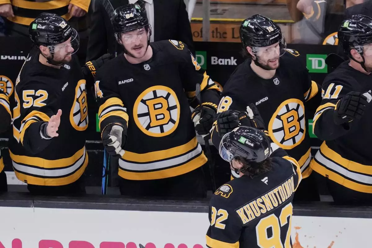 Boston Bruins center Marat Khusnutdinov (92) is congratulated after his goal against the Pittsburgh Penguins during the first period of an NHL hockey game, Tuesday, March 3, 2026, in Boston. (AP Photo/Charles Krupa)