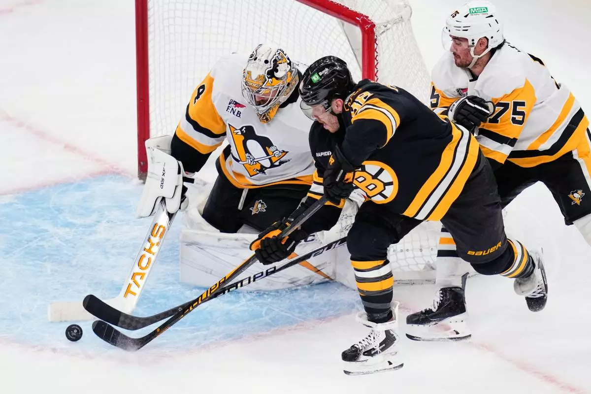 Pittsburgh Penguins goaltender Stuart Skinner, left, makes a save on a shot by Boston Bruins right wing David Pastrnak, center, during the third period of an NHL hockey game, Tuesday, March 3, 2026, in Boston. (AP Photo/Charles Krupa)