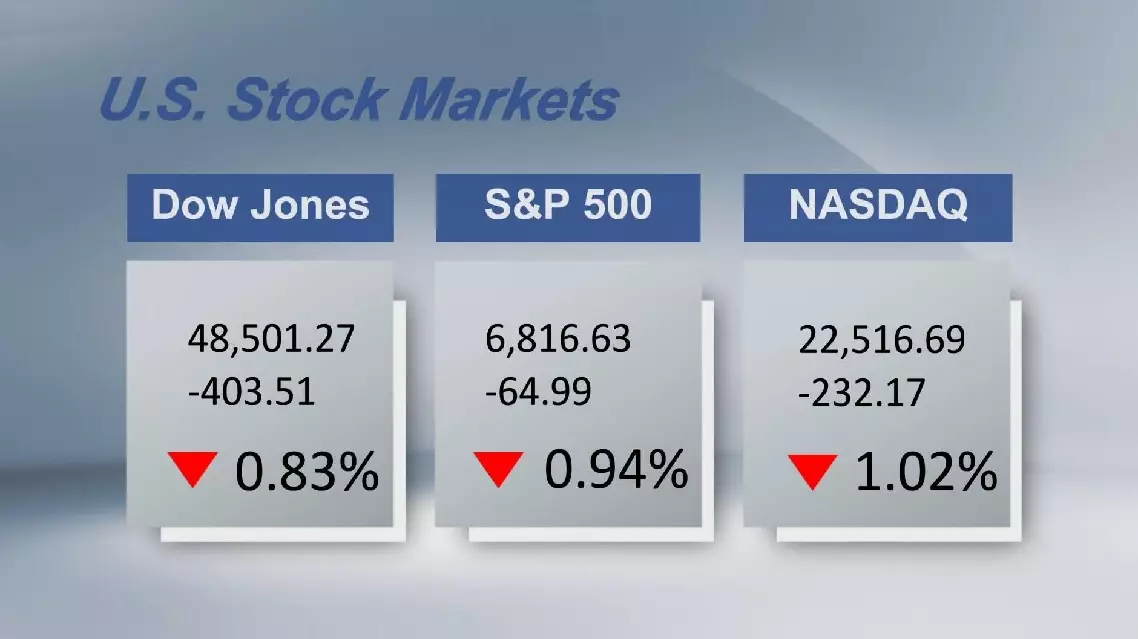 The Dow Jones Industrial Average fell 403.51 points or 0.83 percent to 48,501.27. The S and P 500 sank 64.99 points or 0.94 percent to 6,816.63. The Nasdaq Composite Index shed 232.17 points or 1.02 percent to 22,516.69.