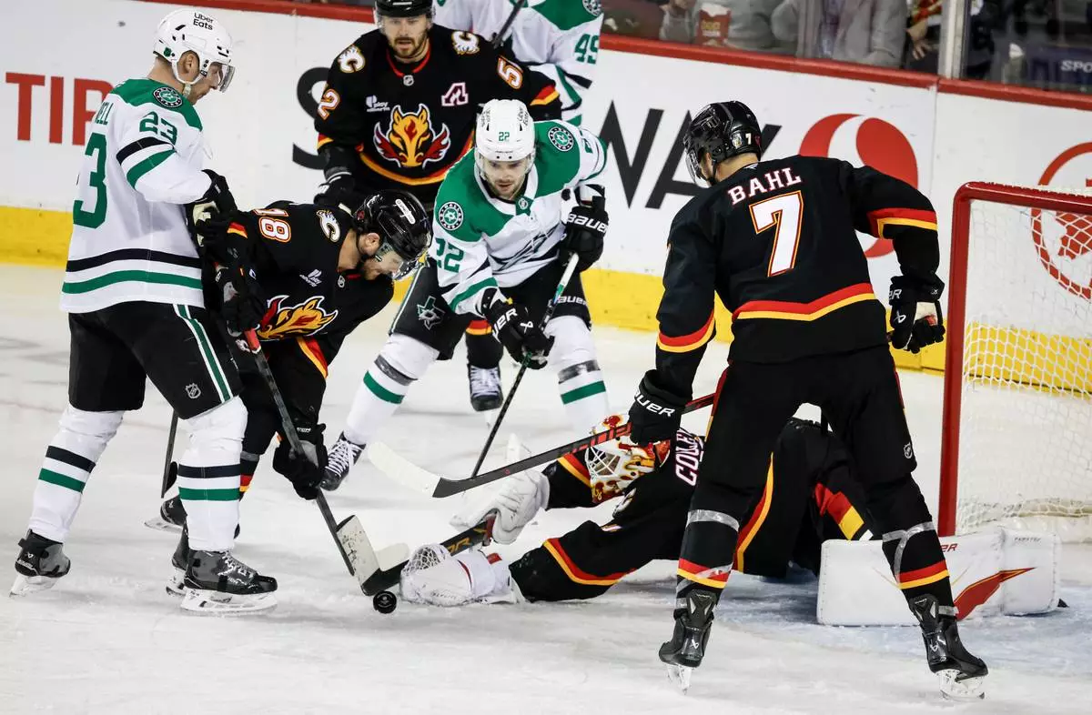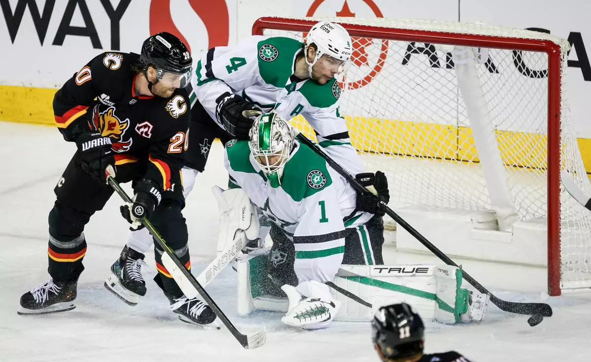 Dallas Stars' Miro Heiskanen (4) reaches over goalie Casey DeSmith (1) to swat the puck away as Calgary Flames' Blake Coleman looks on during the second period of an NHL hockey game in Calgary, Alberta on Tuesday, March 3, 2026. (Jeff McIntosh/The Canadian Press via AP)