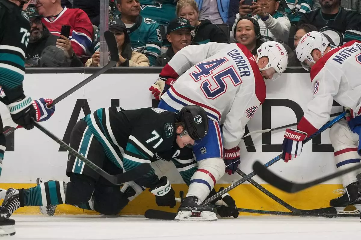 San Jose Sharks center Macklin Celebrini (71) reaches for the puck under Montréal Canadiens defenseman Alexandre Carrier (45) and defenseman Mike Matheson during the first period of an NHL hockey game in San Jose, Calif., Tuesday, March 3, 2026. (AP Photo/Jeff Chiu)