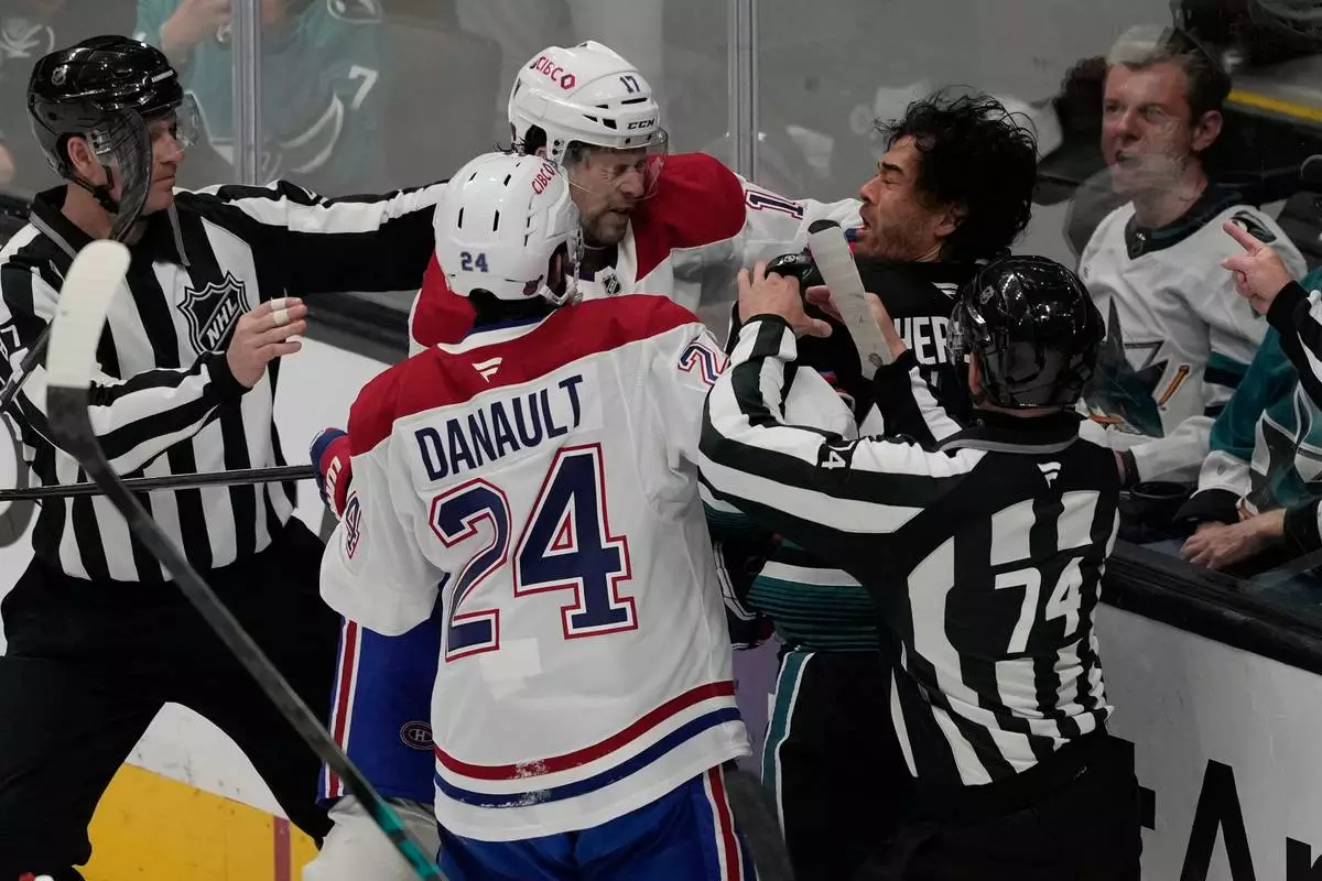 Referees try to separate Montréal Canadiens right wing Josh Anderson, middle left, and center Phillip Danault (24) from San Jose Sharks left wing Kiefer Sherwood, middle right, during the third period of an NHL hockey game in San Jose, Calif., Tuesday, March 3, 2026. (AP Photo/Jeff Chiu)