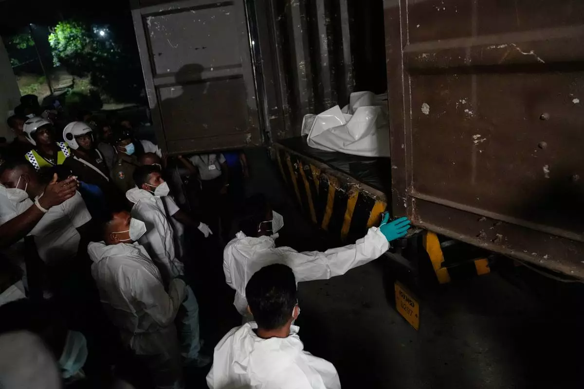 Healthcare workers unload the bodies of Iranian sailors from a vehicle who died when their IRIS Dena warship sank outside Sri Lanka's territorial waters, in Galle, Sri Lanka, Wednesday, March 4, 2026. (AP Photo/Eranga Jayawardena)