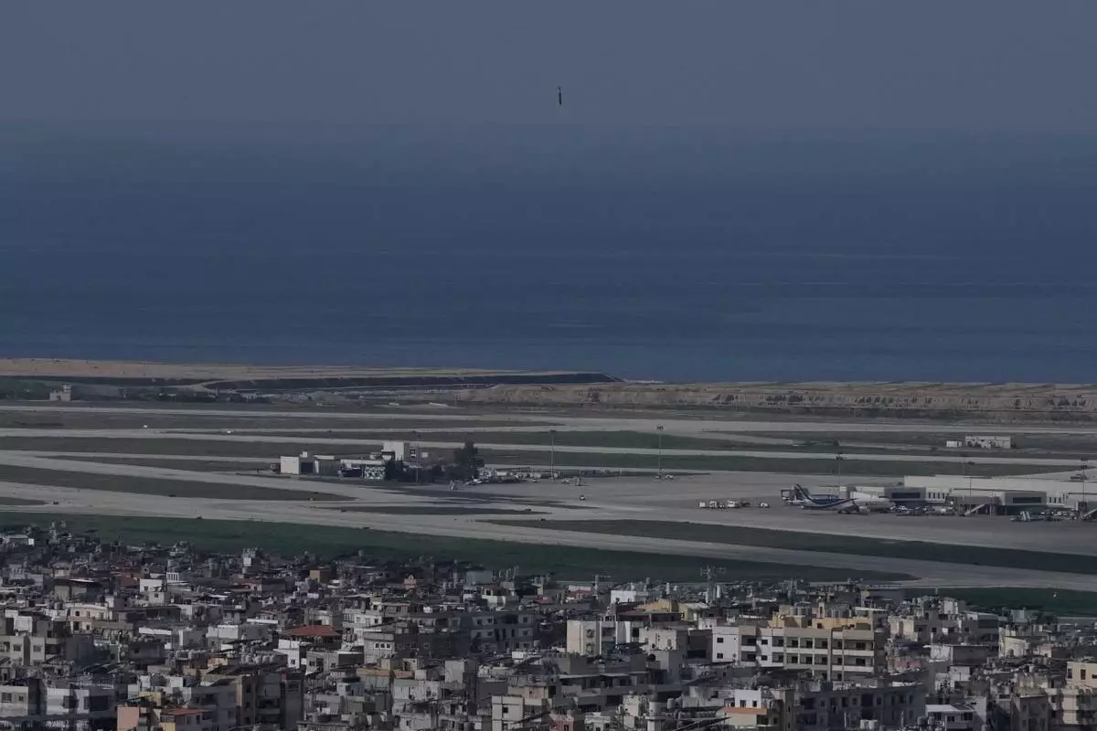 A bomb dropped from an Israeli jet falls before hitting a building in Dahiyeh, southern suburb of Beirut, near Rafik Hariri International Airport, Lebanon, Wednesday, March 4, 2026. (AP Photo/Bilal Hussein)