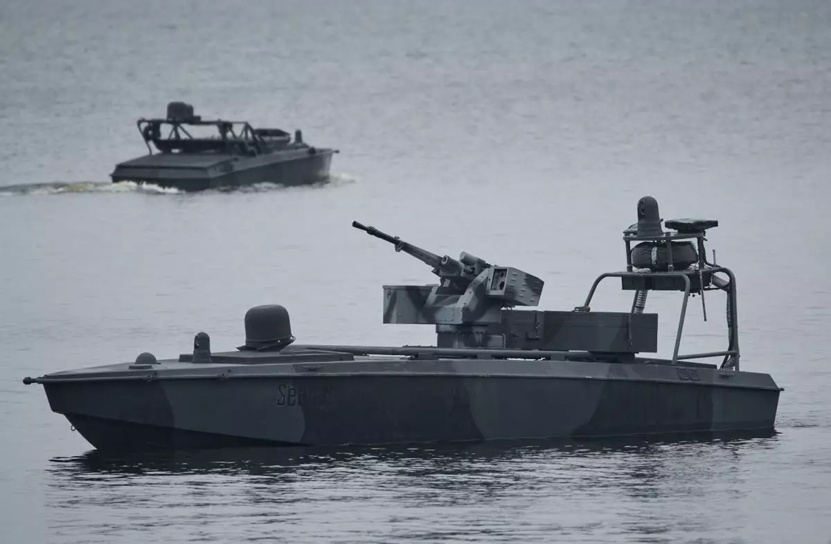 FILE - Sea Baby drones ride on the water during a demonstration by Ukraine's Security Service in an undisclosed location in Ukraine Friday, Oct. 17, 2025. (AP Photo/Efrem Lukatsky, File)