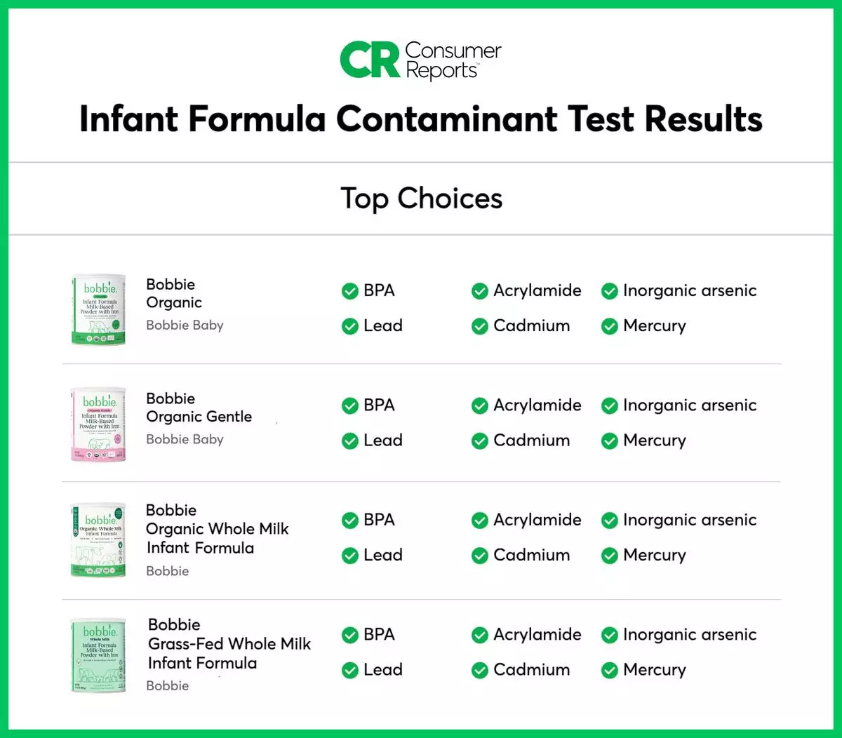 Consumer Reports stated in its published findings: "All the Bobbie formulas we have spot-checked in both rounds of testing have been in the top-choice category, with no or low levels of detected contaminants."