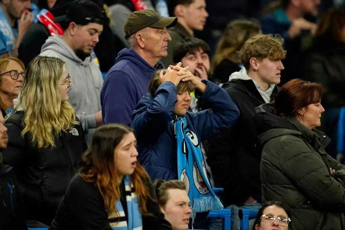 Manchester City supporters react during the English Premier League soccer match between Manchester City and Nottingham Forest in Manchester, England, Wednesday, March 4, 2026. (AP Photo/Dave Thompson)