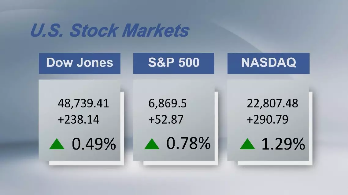 The Dow Jones Industrial Average rose 0.49 percent to 48,739.41. The S and P 500 added 0.78 percent to 6,869.5. The Nasdaq Composite Index increased by 1.29 percent to 22,807.48.
