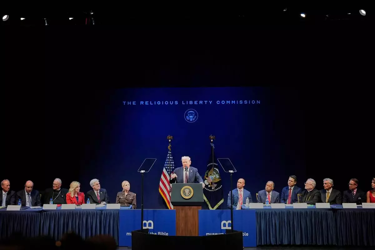 FILE - President Donald Trump speaks at a hearing of the Religious Liberty Commission at the Museum of the Bible, Sept. 8, 2025, in Washington. (AP Photo/Alex Brandon, File)