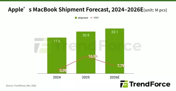 TrendForce forecasts Apple's notebook shipments will grow 7.7% YoY in 2026, pushing macOS market share to 13.2%, fueled by the company's downward extension of price tiers, proactive pricing strategy, and strong supply chain control when compared to peers. Shipments of the MacBook Neo alone could reach 4–5 million units, depending on consumer acceptance of its 8 GB memory configuration.