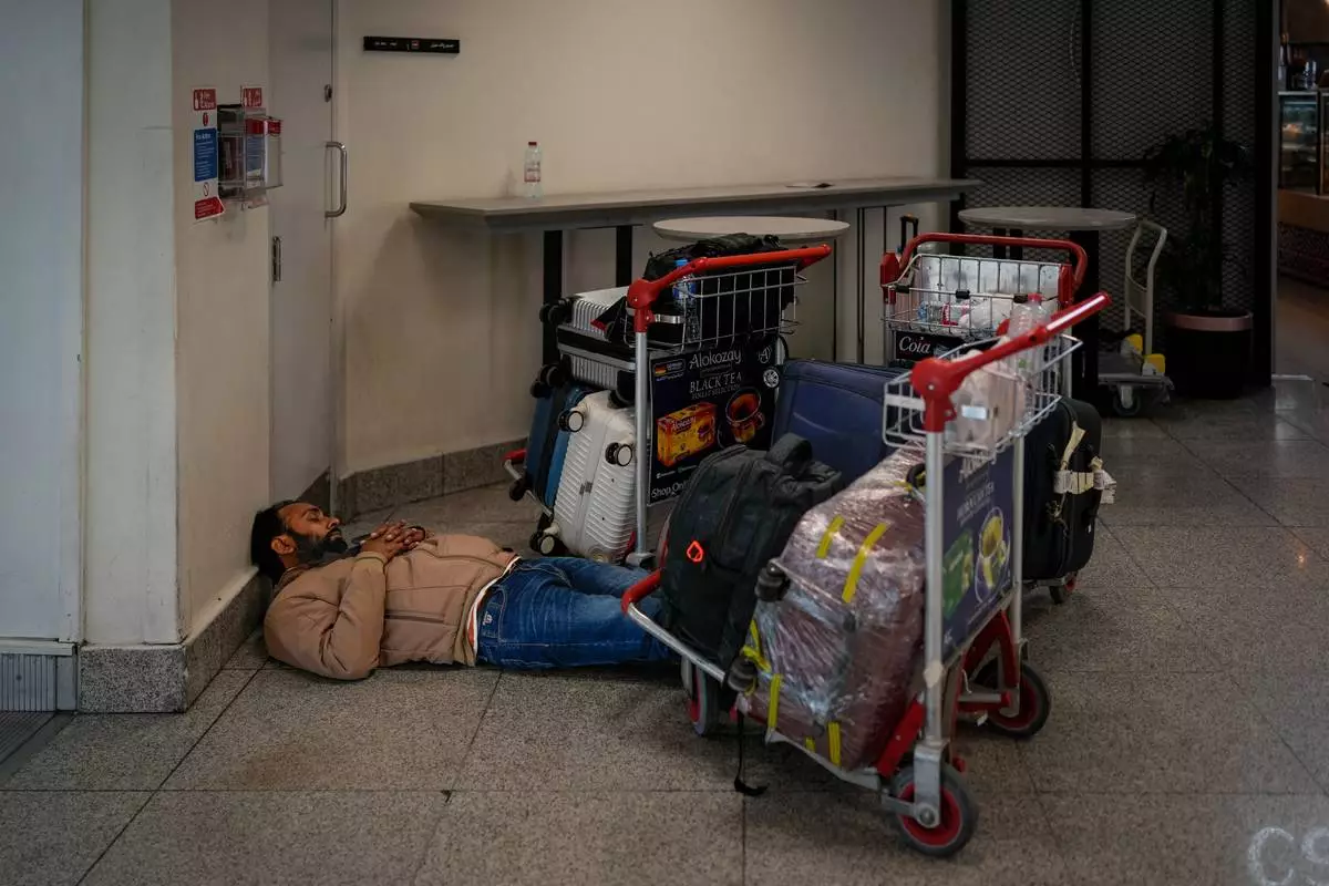 A stranded passenger sleeps on the floor outside Dubai International Airport terminal as the airport resumes limited operations in Dubai, United Arab Emirates, Thursday, March 5, 2026. (AP Photo/Altaf Qadri)