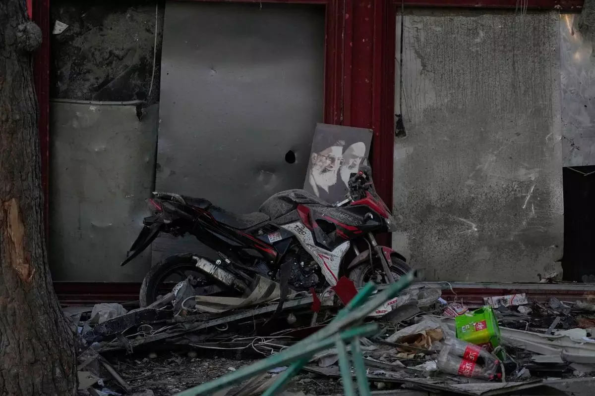 A poster of the late Supreme Leader Ayatollah Ali Khamenei, who was killed during the ongoing joint U.S.-Israeli military campaign, and the late Iranian Revolutionary founder Ayatollah Khomeini, right, lays on a motorcycle amid debris left by a strike in Tehran, Iran, Monday, March 2, 2026. (AP Photo/Vahid Salemi)