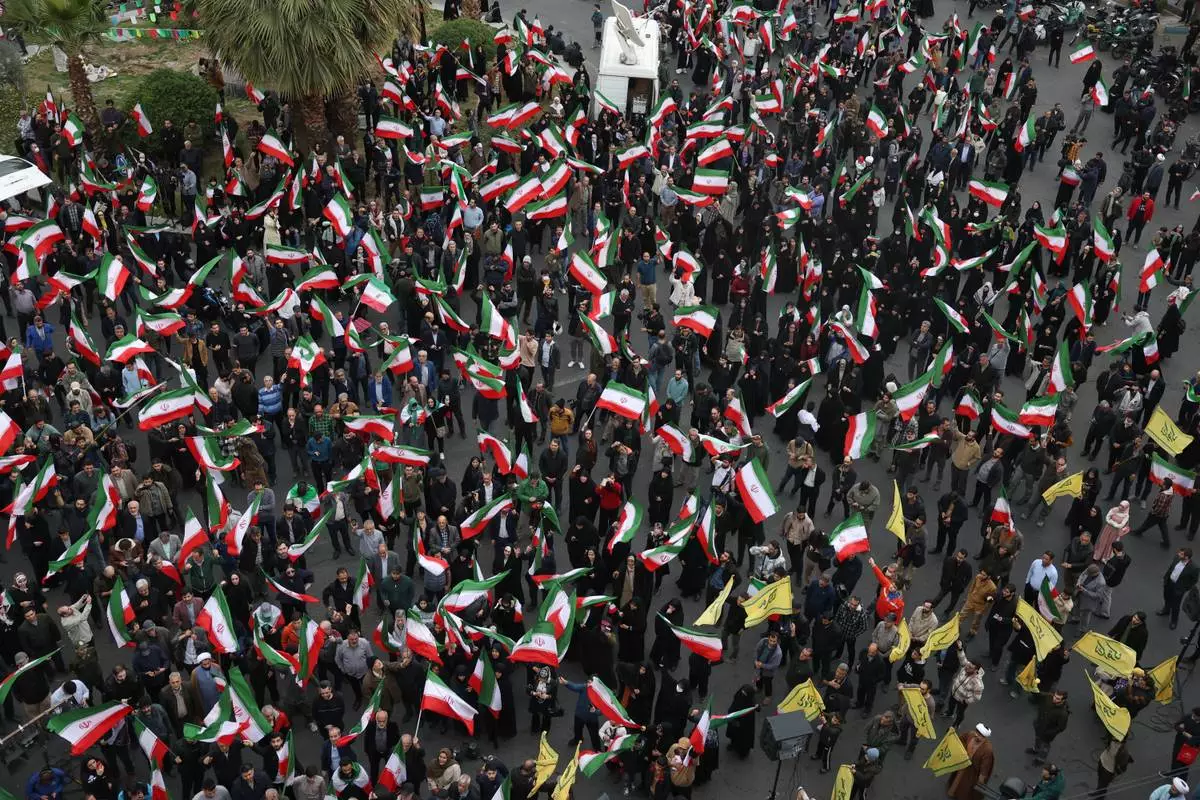Demonstrators wave Iranian flags in a demonstration in support of the government and against U.S. and Israeli strikes in Tehran, Iran, Saturday, Feb. 28, 2026. (AP Photo/Vahid Salemi)