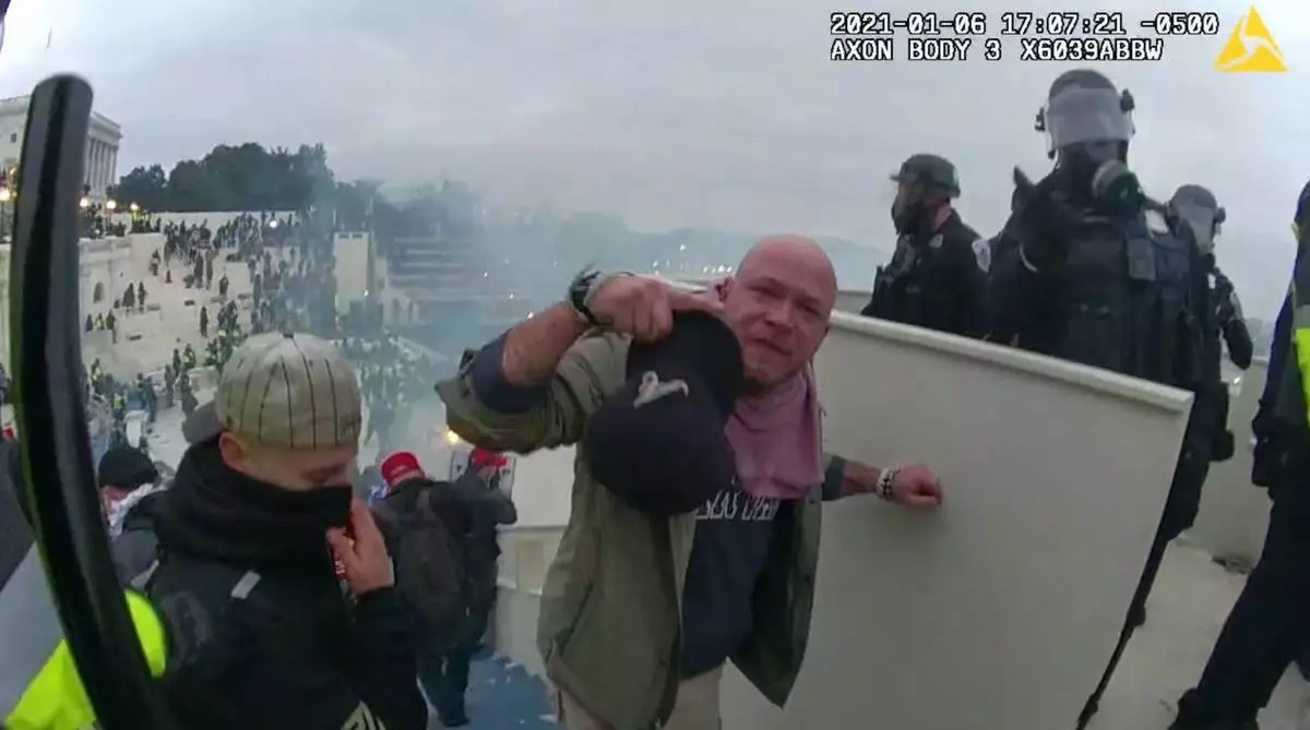 This image from video provided by the Department of Justice from police-worm body camera shows Andrew Paul Johnson on the Lower West Terrace of the U.S. Capitol in Washington, Jan. 6, 2021. (Department of Justice via AP)