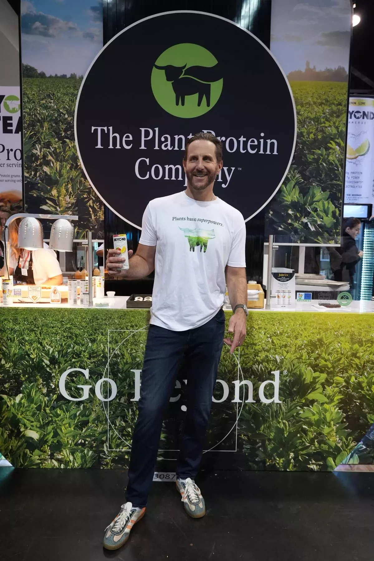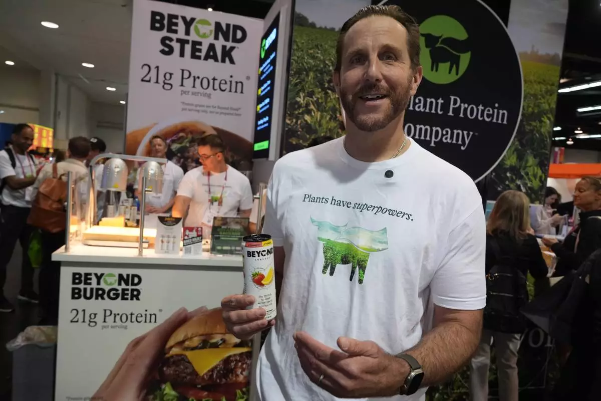Beyond CEO Ethan Brown, the company's founder, poses for a photo at his Beyond booth as the company is transitioning from Beyond Meat to just Beyond, to introduce a new line of sparkling plant‑protein drinks at the Natural Products Expo West 2026 at the Anaheim Convention Center in Anaheim, Calif., on Thursday, March 5, 2026. (AP Photo/Damian Dovarganes)