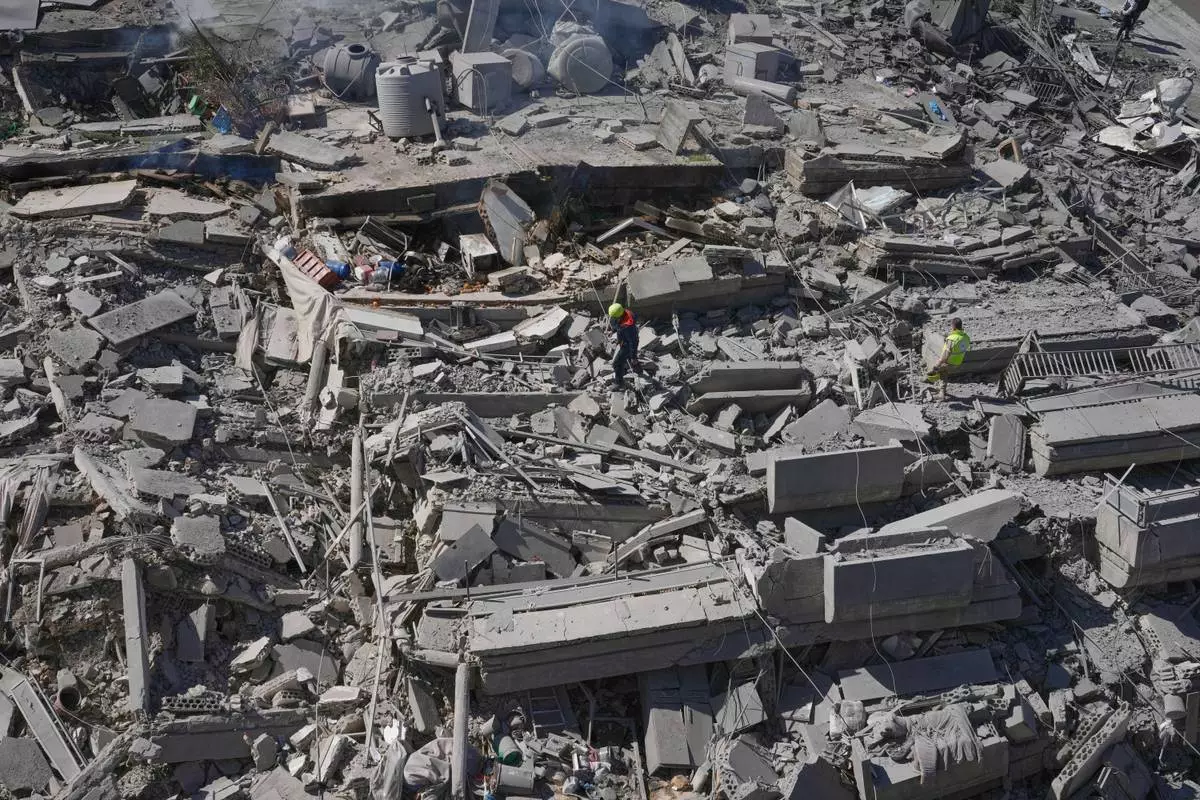 Rescue workers check a destroyed building that was hit by an Israeli airstrike in Nabatiyeh town, south Lebanon, Thursday, March 5, 2026. (AP Photo/Mohammed Zaatari)