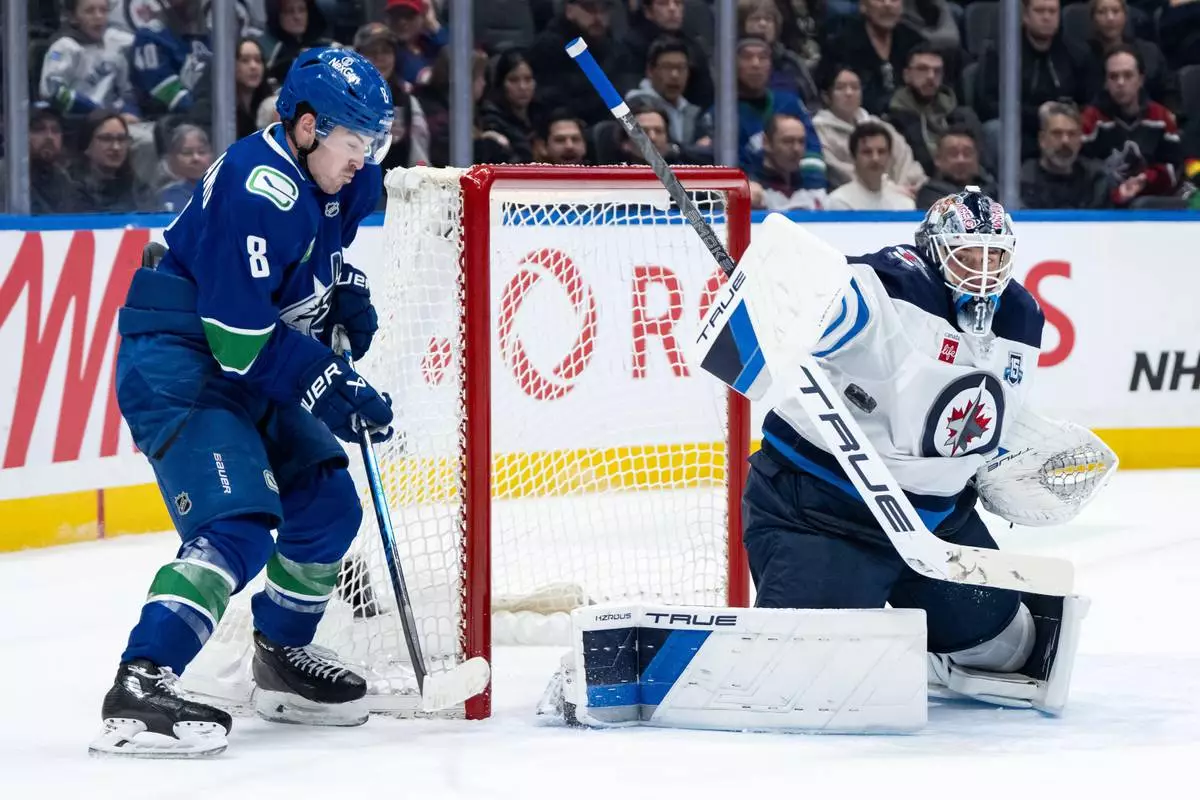 Vancouver Canucks' Conor Garland (8) watches as Winnipeg Jets goaltender Eric Comrie (1) stops the puck during the third period of an NHL hockey game in Vancouver, B.C., on Wednesday, Feb. 25, 2026. (Ethan Cairns/The Canadian Press via AP)