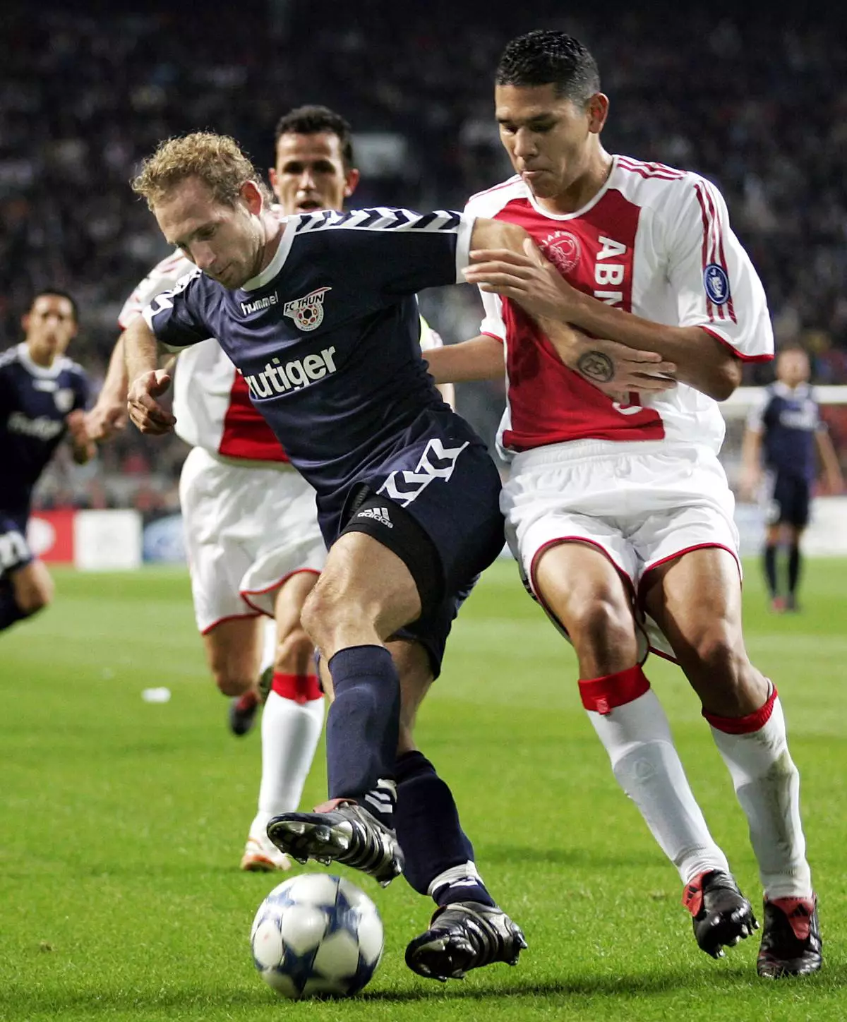 FILE - Hedwiges Maduro of Ajax, right, in a duel for the ball with Mauro Lustrinelli of FC Thun during the UEFA Champions League group B soccer match between AFC Ajax and FC Thun at the Arena stadium in Amsterdam, the Netherlands, Tuesday Oct. 18, 2005. (AP Photo/Fred Ernst, file)