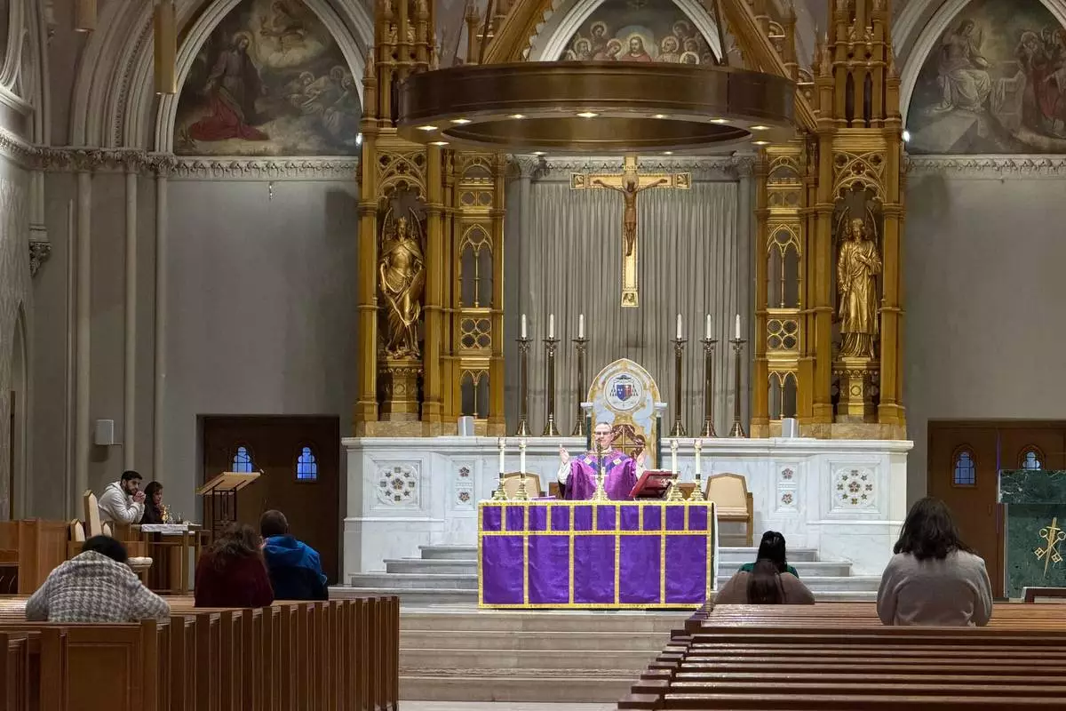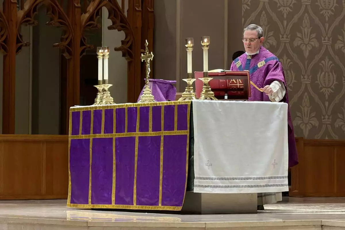 A Roman Catholic priest says a prayer during an afternoon Mass at the Cathedral of Saints Peter and Paul, which serves as the home church of the Roman Catholic Diocese of Providence, on Thursday, March 5, 2026, in Providence, R.I. (AP Photo/Rodrique Ngowi)