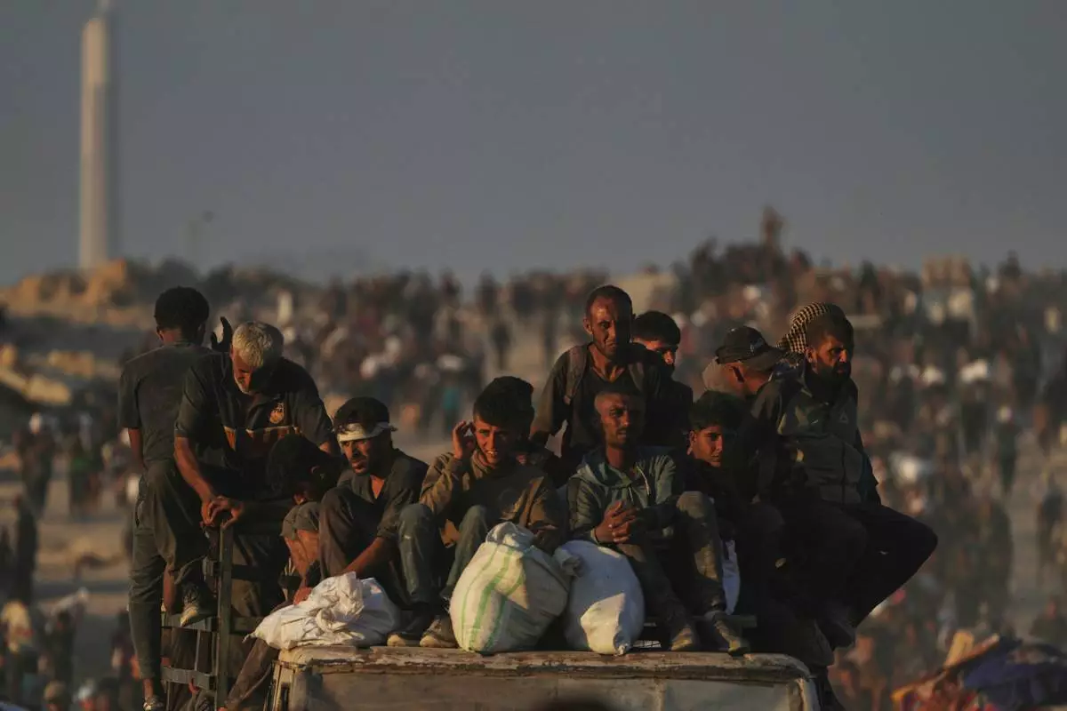 FILE - Palestinians carry sacks of flour unloaded from a humanitarian aid convoy that reached Gaza City from the northern Gaza Strip, Sunday, Aug. 24, 2025. (AP Photo/Abdel Kareem Hana, File)