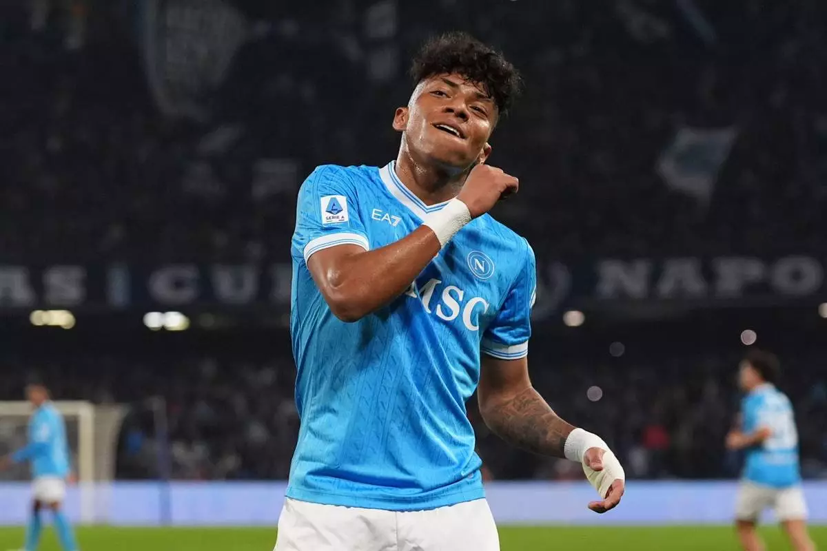 Napoli's Alisson Santos celebrates scoring during the Serie A soccer match between Napoli and Torino in Naples, Italy, Friday March 6, 2026. (Alfredo Falcone/LaPresse via AP)