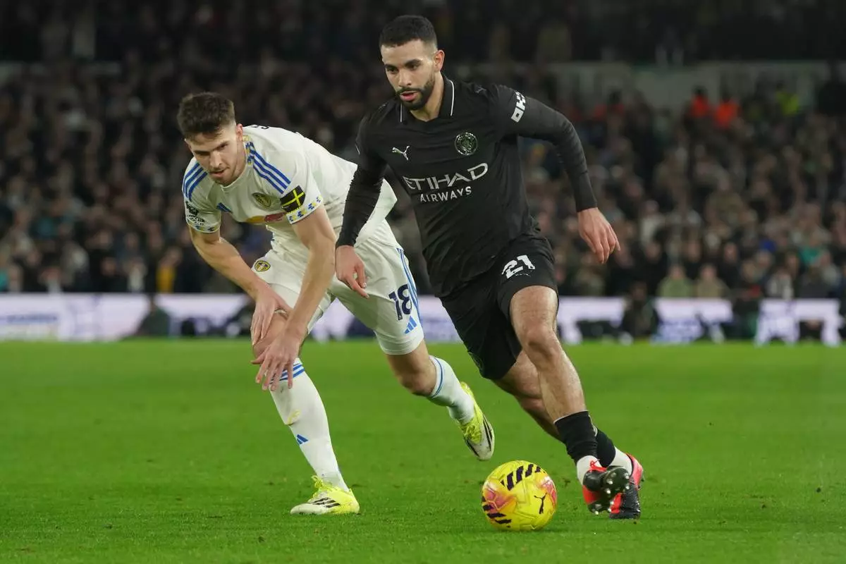 Leeds' Anton Stach, left, and Manchester City's Rayan Ait-Nouri fight for the ballduring the Premier League soccer match between Leeds United and Manchester City in Leeds, England, Saturday, Feb. 28, 2026. (AP Photo/Ian Hodgson)