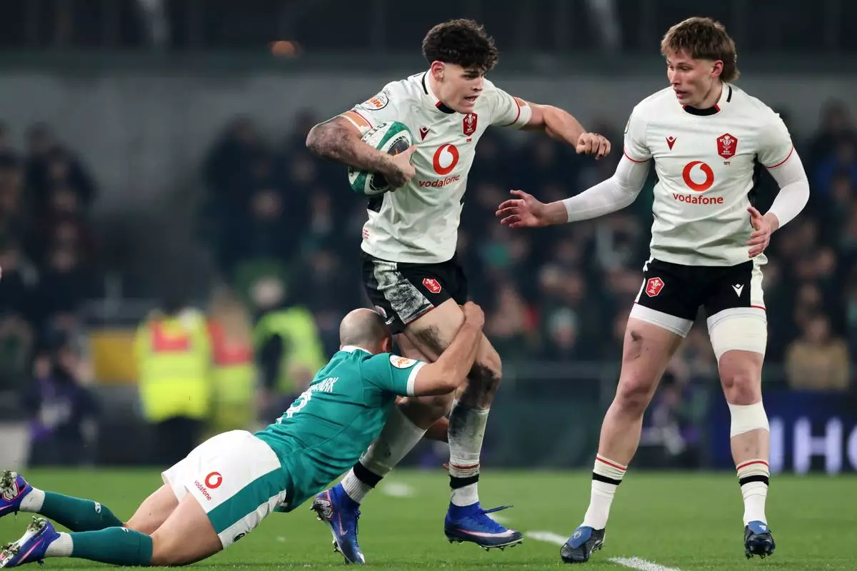 Wales' Eddie James, center, is tackled by Ireland's Jamison Gibson-Park during a Six Nations rugby union match between Ireland and Wales in Dublin, Ireland, Friday, March 6, 2026. (AP Photo/Peter Morrison)