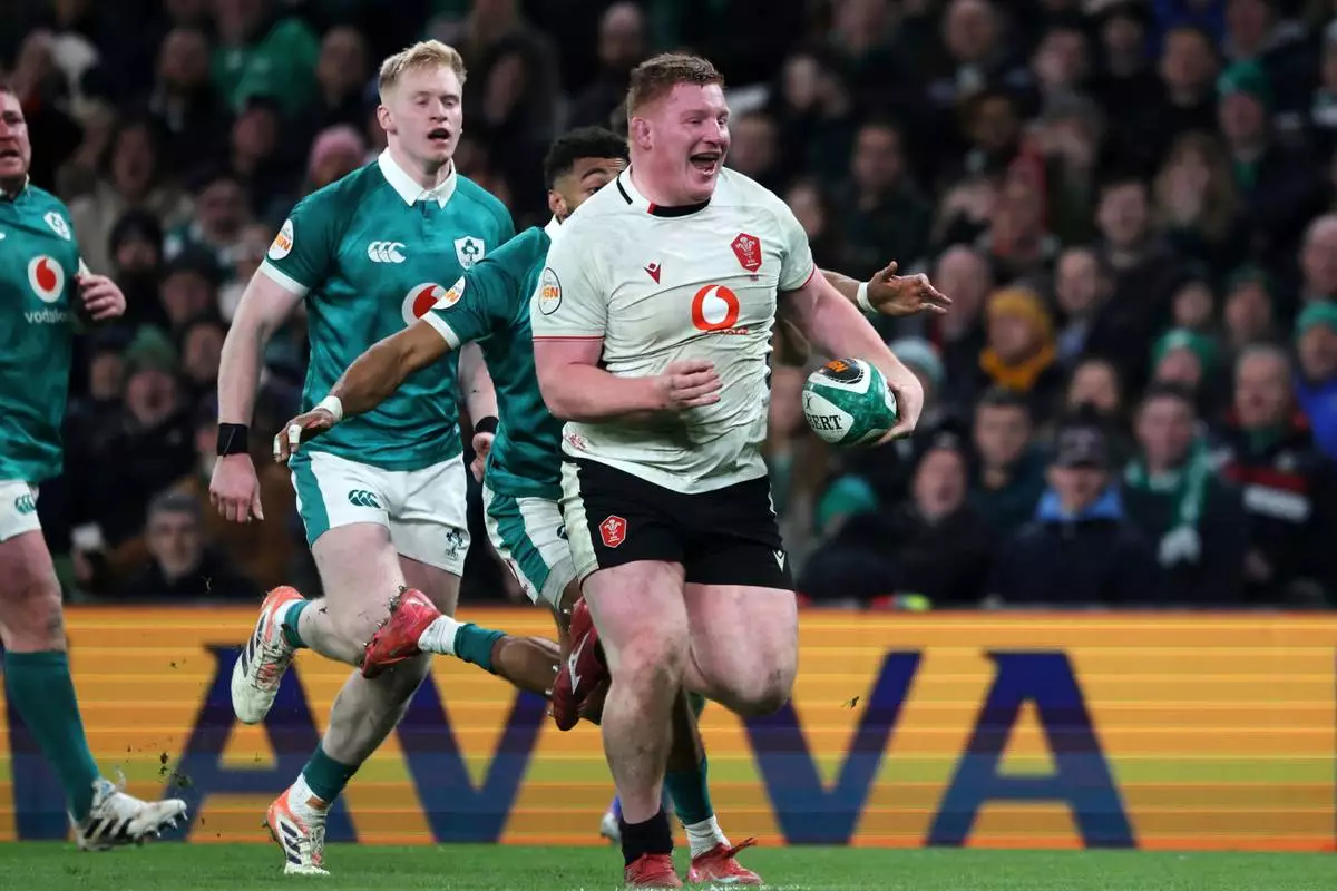 Wales' Rhys Carre, front, breaks through to score his team's first try during a Six Nations rugby union match between Ireland and Wales in Dublin, Ireland, Friday, March 6, 2026. (AP Photo/Peter Morrison)