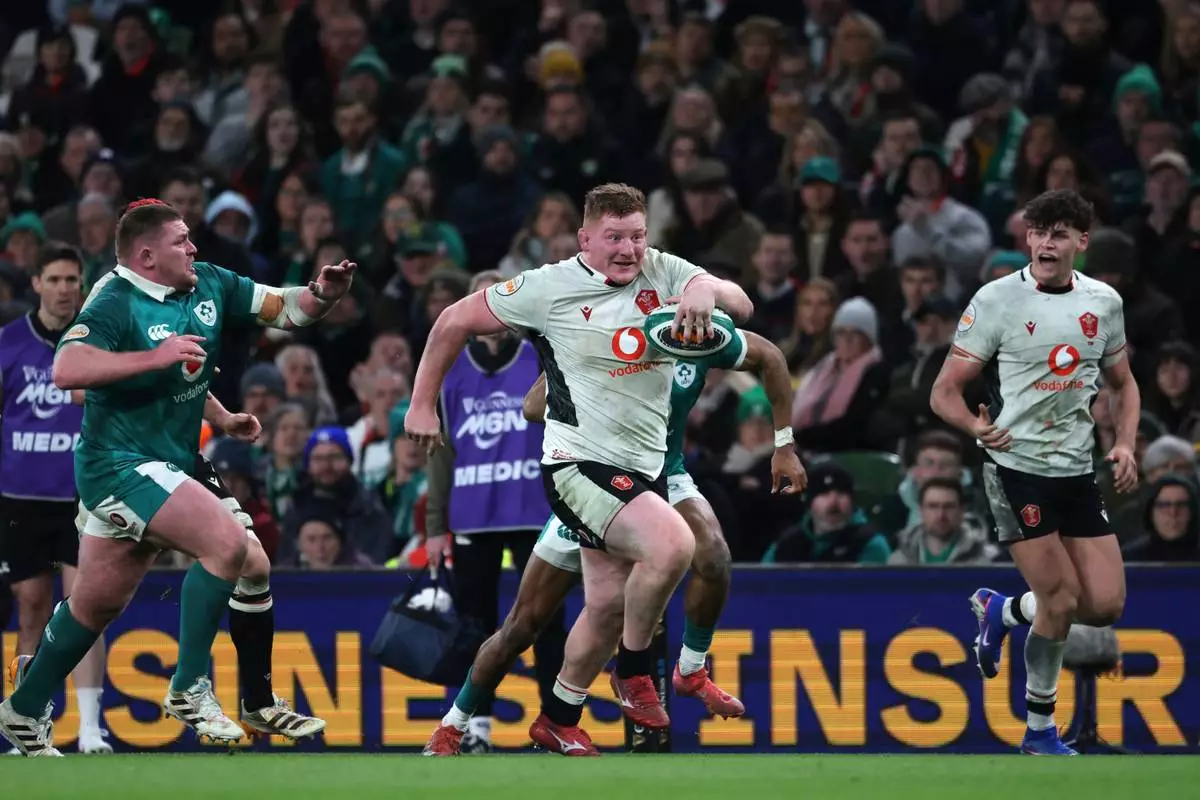 Wales' Rhys Carre, center, breaks through to score his team's first try during a Six Nations rugby union match between Ireland and Wales in Dublin, Ireland, Friday, March 6, 2026. (AP Photo/Peter Morrison)