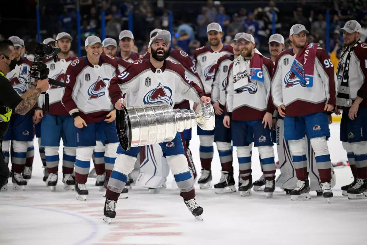 FILE - Colorado Avalanche center Nazem Kadri (91) lifts the Stanley Cup after the team defeated the Tampa Bay Lightning in Game 6 of the NHL hockey Stanley Cup Finals, June 26, 2022, in Tampa, Fla. (AP Photo/Phelan M. Ebenhack, File)
