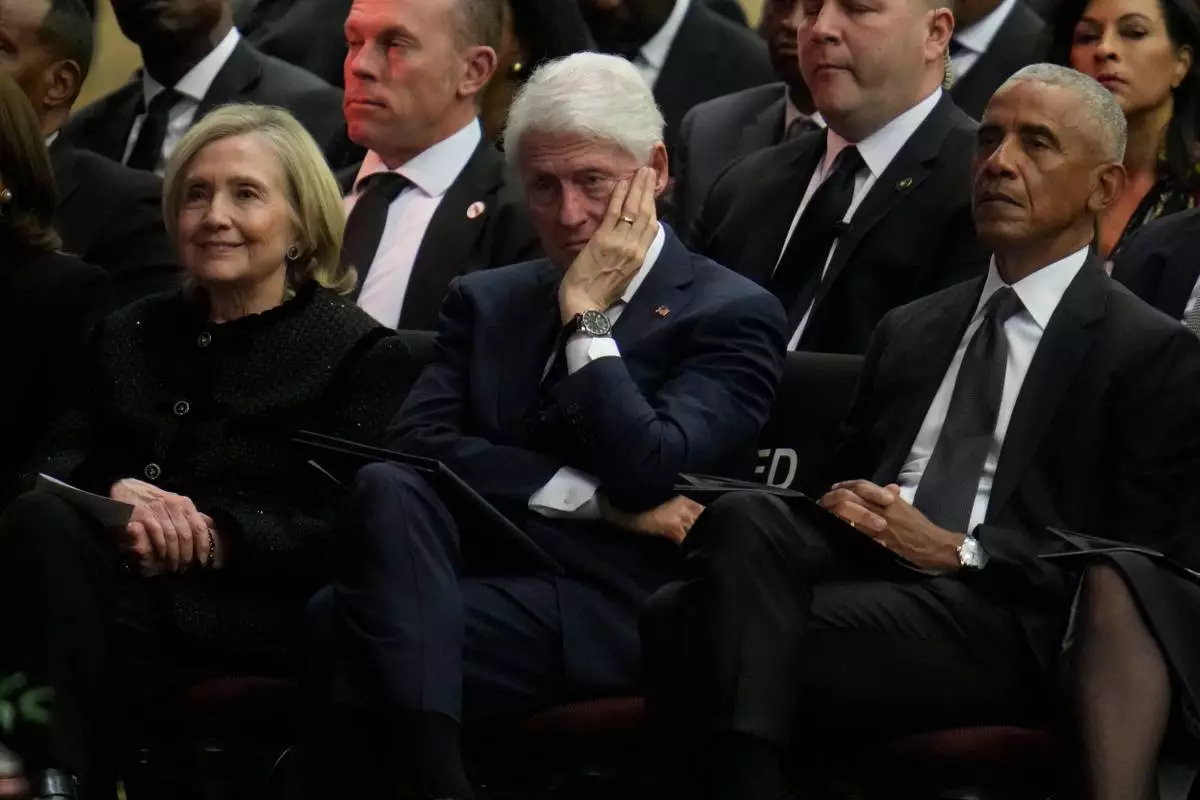 Former Secretary of State Hillary Clinton, former President Bill Clinton and former President Barack Obama attend the Public Homegoing Service for Reverend Jesse Jackson at the House of Hope in Chicago, Friday, March 6, 2026. (AP Photo/Erin Hooley)