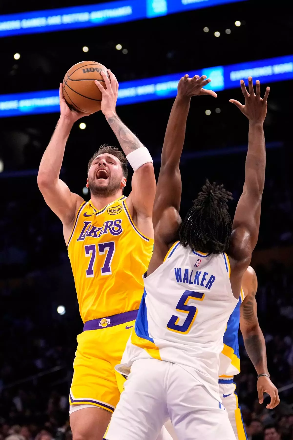 Los Angeles Lakers guard Luka Doncic, left, shoots as Indiana Pacers forward Jarace Walker defends during the first half of an NBA basketball game Friday, March 6, 2026, in Los Angeles. (AP Photo/Mark J. Terrill)