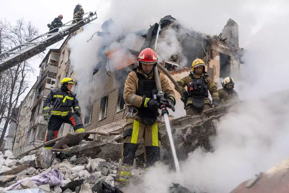 Firefighters put out the fire in the ruins of an apartment building following Russia's missile attack in Kharkiv, Ukraine, Saturday, March 7, 2026. (AP Photo/Andrii Marienko)