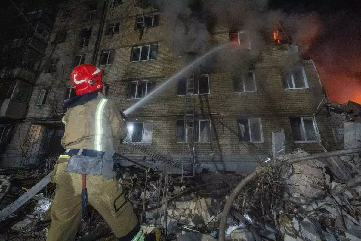 KYIV, Ukraine (AP) — At least seven people were killed and 10 others, including three children, were wounded on Saturday by a Russian missile that hit a five-story residential building in Ukraine's second-largest city, Kharkiv, officials said.