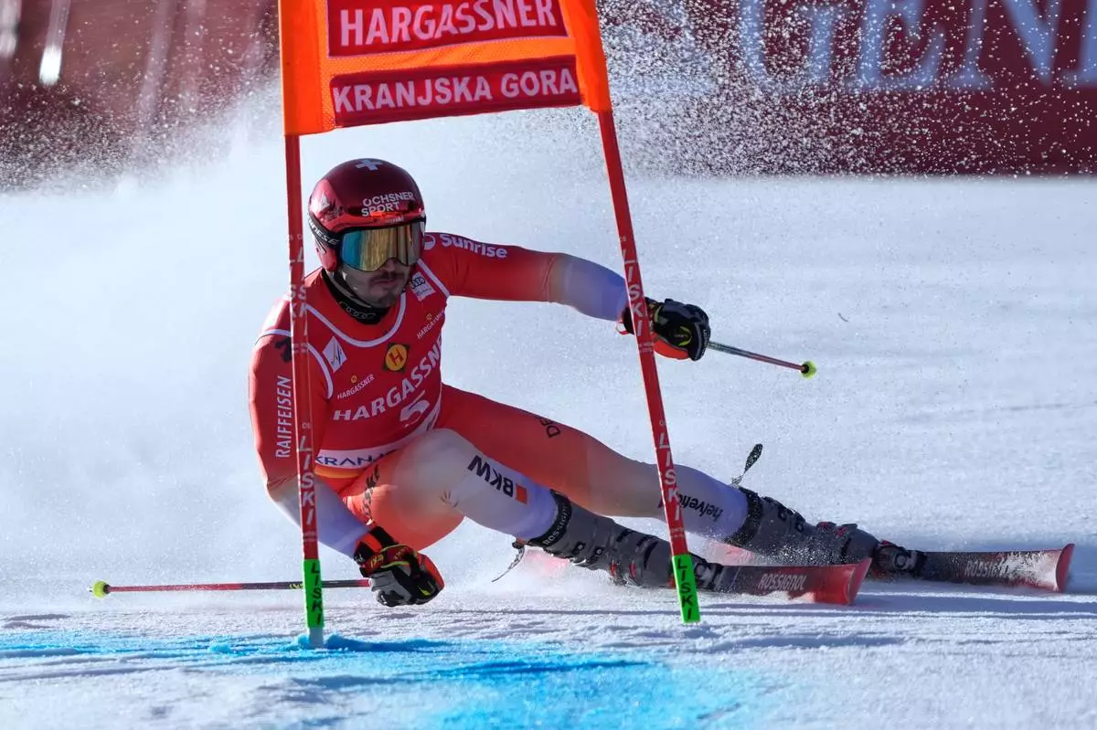 Switzerland's Loic Meillard competes during an alpine ski, men's World Cup giant slalom, in Kranjska Gora, Slovenia, Saturday, March 7, 2026. (AP Photo/Giovanni Auletta)
