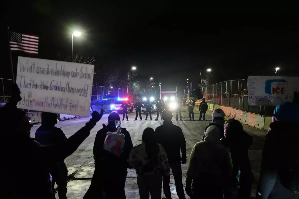 FILE - Federal immigration officers confront protesters outside Bishop Henry Whipple Federal Building in Minneapolis, on Thursday, Jan. 15, 2026. (AP Photo/Yuki Iwamura, File)