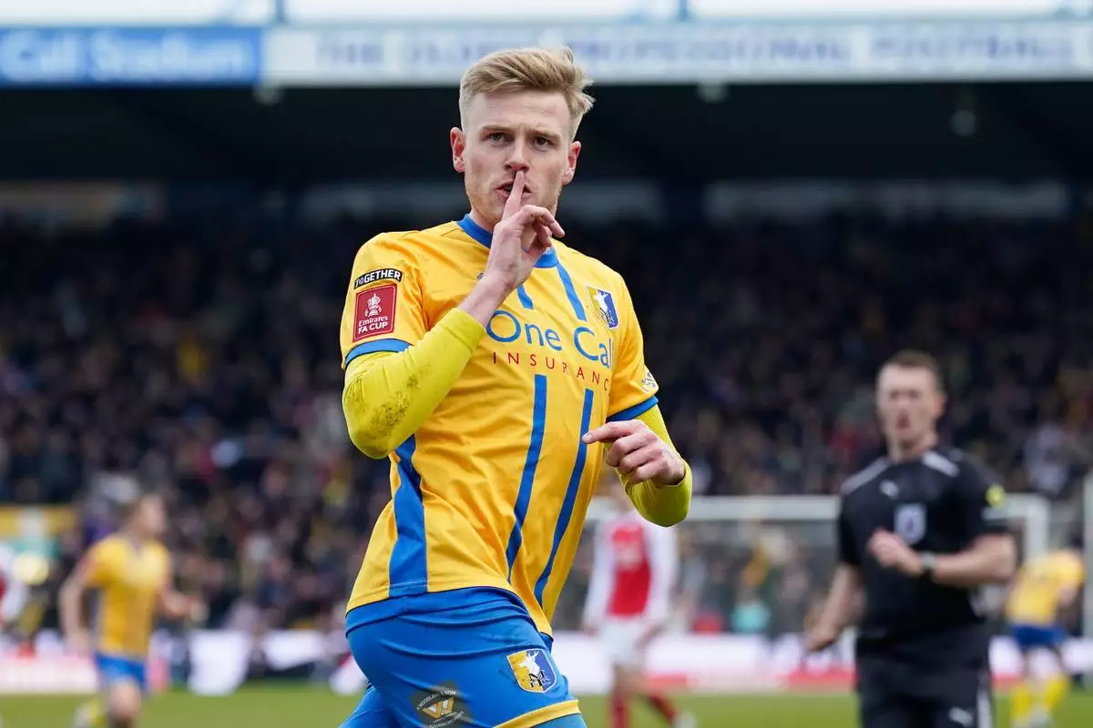 Mansfield's Will Evans celebrates after scoring his side's first goal during the English FA Cup soccer match between Mansfield Town and Arsenal in Mansfield, England, Saturday, March 7, 2026.(AP Photo/Dave Thompson)