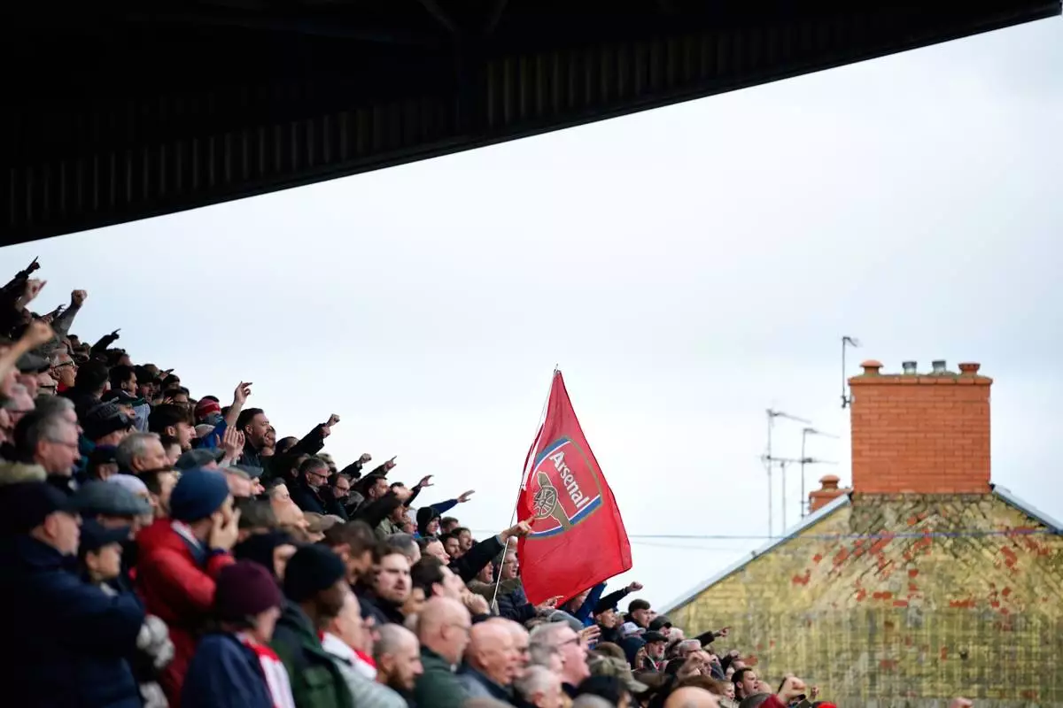 Arsenal's fans cheer during the English FA Cup soccer match between Mansfield Town and Arsenal in Mansfield, England, Saturday, March 7, 2026.(AP Photo/Dave Thompson)