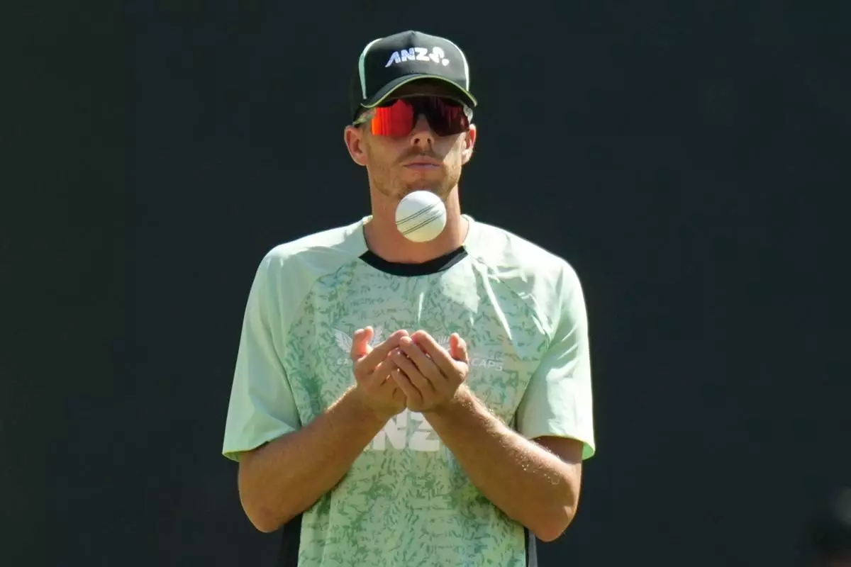 New Zealand's captain Mitchell Santner toss a ball during a practice session ahead of the T20 World Cup cricket final match against India in Ahmedabad, India, Saturday, March 7, 2026. (AP Photo/Ajit Solanki)
