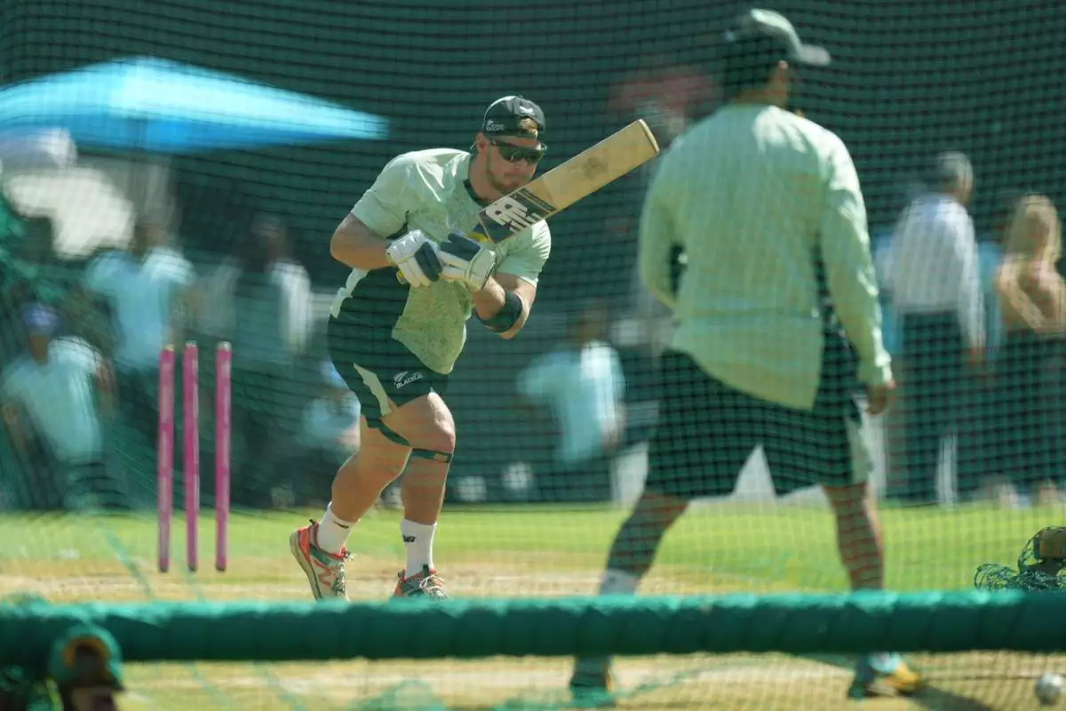 New Zealand's Glenn Phillips bats, left, bats during a practice session ahead of the T20 World Cup cricket final match against India in Ahmedabad, India, Saturday, March 7, 2026. (AP Photo/Ajit Solanki)