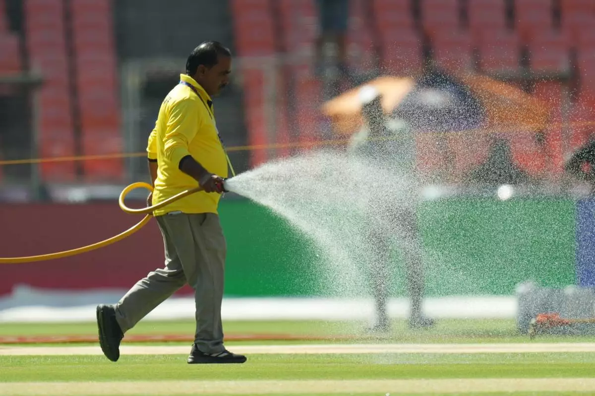 A groundsman sprays water on the pitch ahead of the T20 World Cup cricket final match between India and New Zealand in Ahmedabad, India, Saturday, March 7, 2026. (AP Photo/Ajit Solanki)