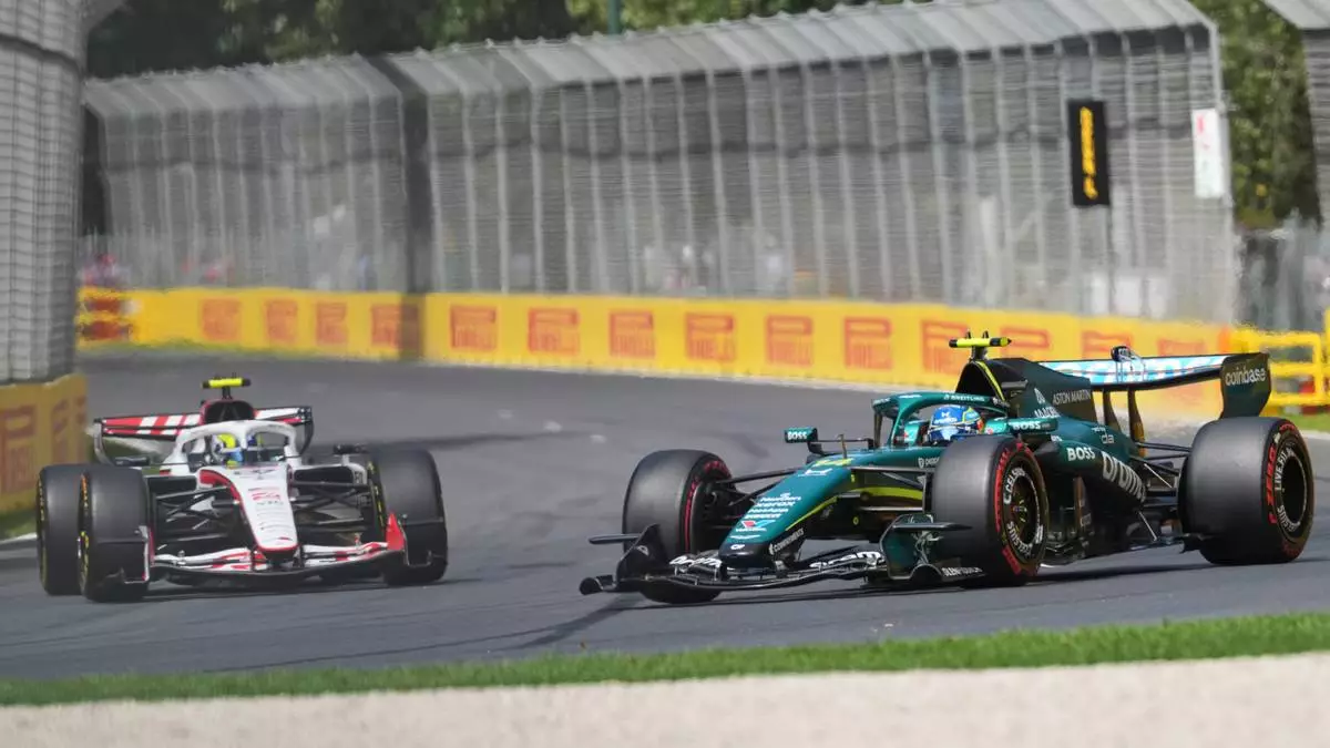Aston Martin driver Fernando Alonso, right, of Spain steers his car ahead of Haas driver Oliver Bearman of Britain during the third practice session for the Australian Formula One Grand Prix at Albert Park, in Melbourne, Australia, Saturday, March 7, 2026. (AP Photo/Heath McKinley )