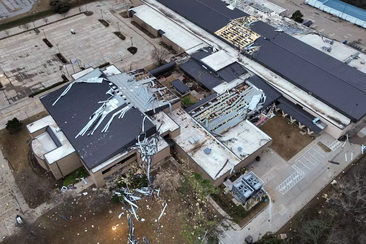 The Tulsa Tech Peoria Campus damaged by a Friday night storm is shown Saturday, March 7, 2026 in Tulsa, Okla. (Mike Simons/Tulsa World via AP)