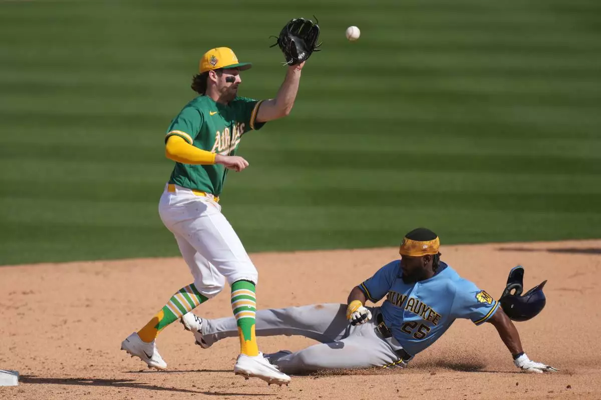 Milwaukee Brewers' Akil Baddoo (25) steals second base as Athletics shortstop Jacob Wilson, left, reaches for a late throw during the fifth inning of a spring training baseball game Tuesday, Feb. 24, 2026, in Mesa, Ariz. (AP Photo/Ross D. Franklin)