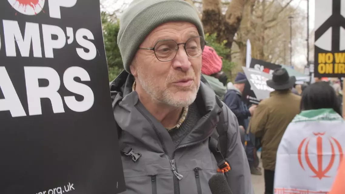 "They are going in, they're bombing people indiscriminately. Over 160 school children have been killed for no good reason," another protester said, referring to the U.S.-Israeli airstrike on the Shajareh Tayyebeh girls' elementary school in Minab, southern Iran.