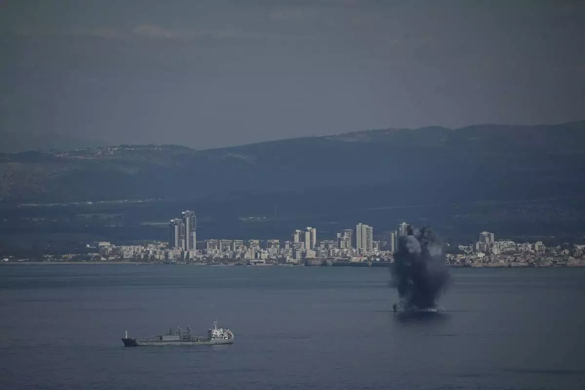 An incoming projectile explodes over the water as Israel issues a nationwide alert following its strikes on Iran, in Haifa Bay, northern Israel, Saturday, Feb. 28, 2026. (AP Photo/Leo Correa)