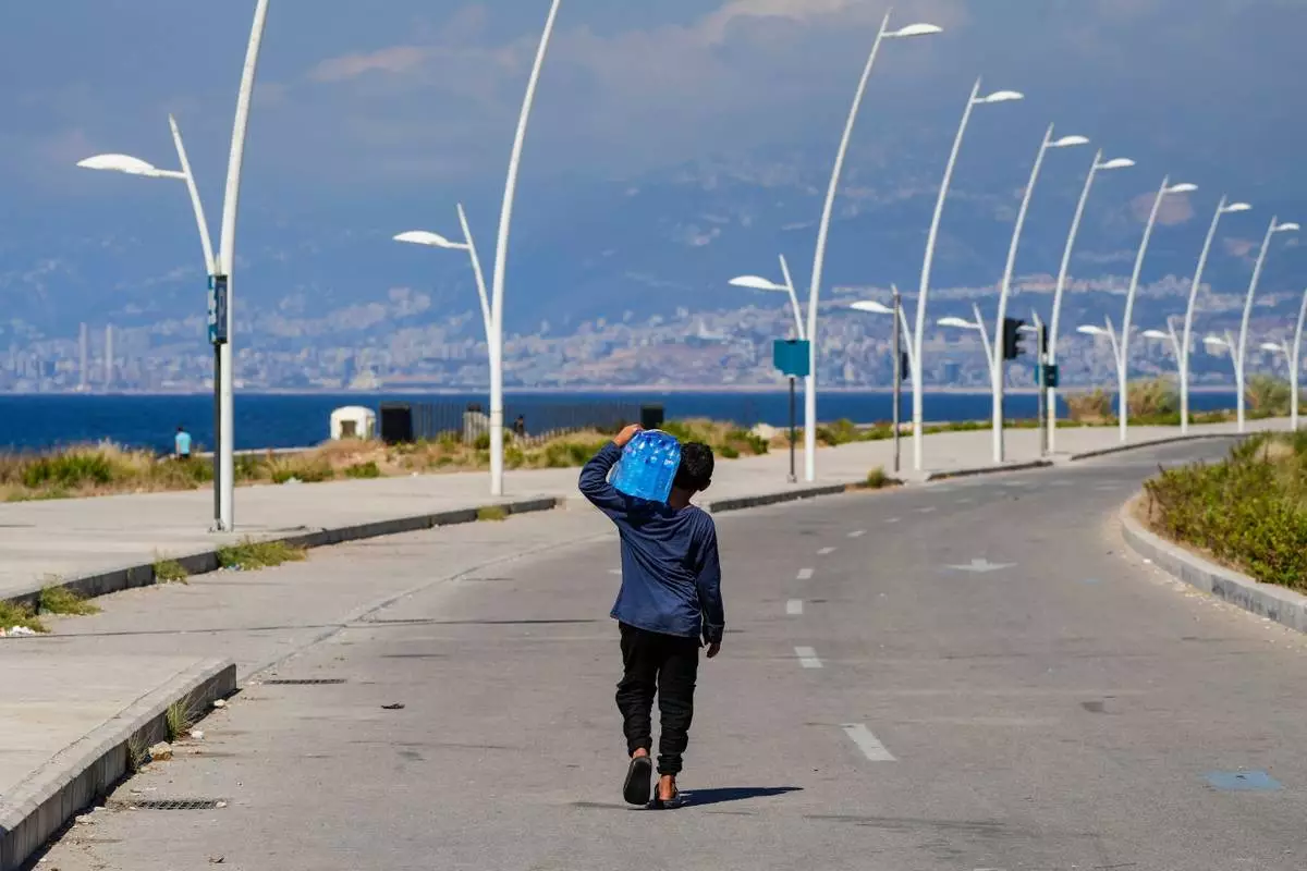 FILE - A young street vendor carries a pack of water bottles as he looking for customers during a sweltering day on the Mediterranean Sea corniche in Beirut, Lebanon, July 20, 2023. (AP Photo/Hassan Ammar, File)