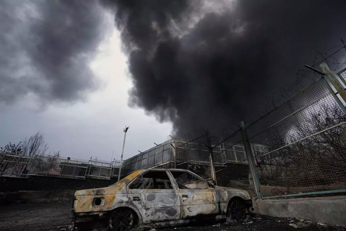 Smoke rise as strikes hit the city during the U.S.–Israeli military campaign, in Tehran, Iran, Saturday, March 7, 2026. (AP Photo/Vahid Salemi)